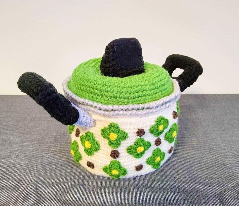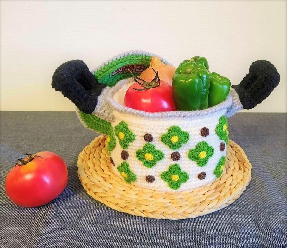 昭和レトロなホーロー鍋を毛糸で編んでみました。