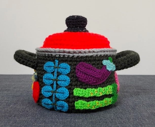 今回は北欧風レトロ鍋をダークブルーグリーン(暗い青緑)を基調に編んでみました♪