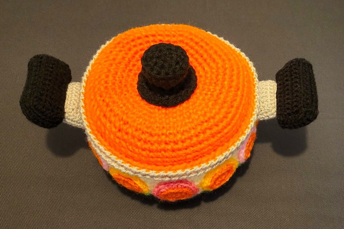 可愛い花を敷き詰めたお花畑をイメージした毛糸で編んだ昭和レトロな愛らしいホーロー鍋です♪